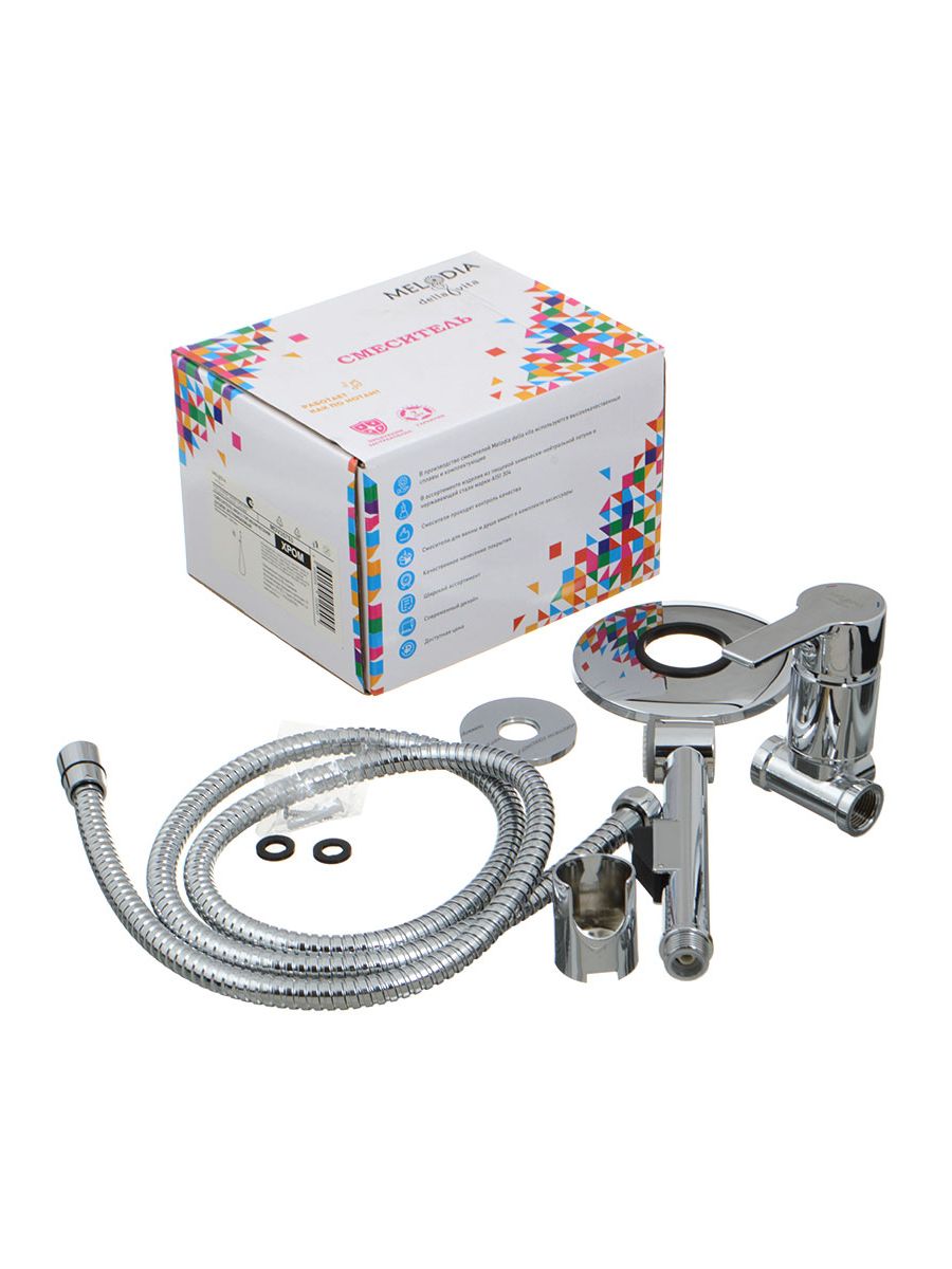 Латунный корпус (встраиваемая в стену часть), хромированная накладка из нержавеющей стали (наружная часть), ручка цинк хромированная, керамический картридж Wanhai/Mingdi 35мм, латунная гайка картриджа, латунный держатель лейки хромированный, гигиеническая лейка из пластика хромированная, шланг 1,5м из нерж.стали хромированный с двойной оплеткой.