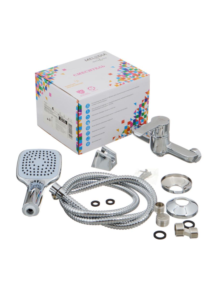 Корпус латунь хромированный, ручка цинк в цвет корпуса, картридж керамический Wanhai/Mingdi 35мм, латунная гайка картриджа, латунные эксцентрики, отражатели из нерж.стали хромированные, шланг 1,5м нерж.сталь, держатель лейки и лейка 1 функция 90х90мм квадратная в цвет корпуса