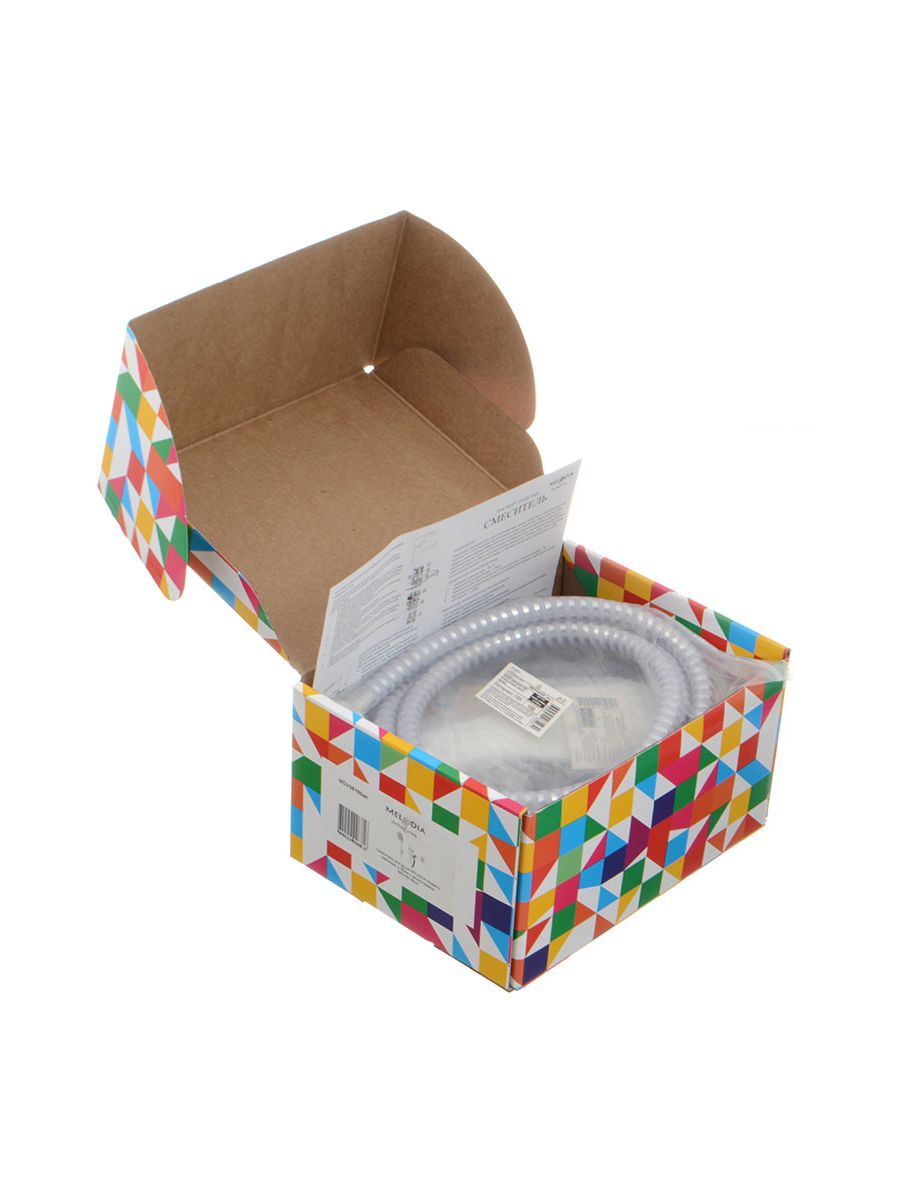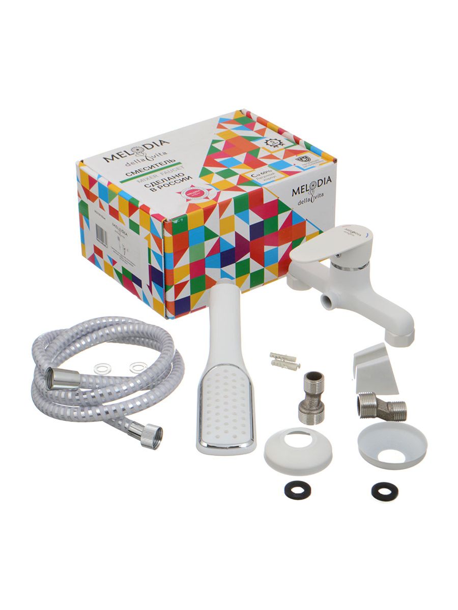 Смеситель для душа MELODIA Moderno в белом цвете с современными аксессуарами: лейкой, удобным шлангом и кронштейном.