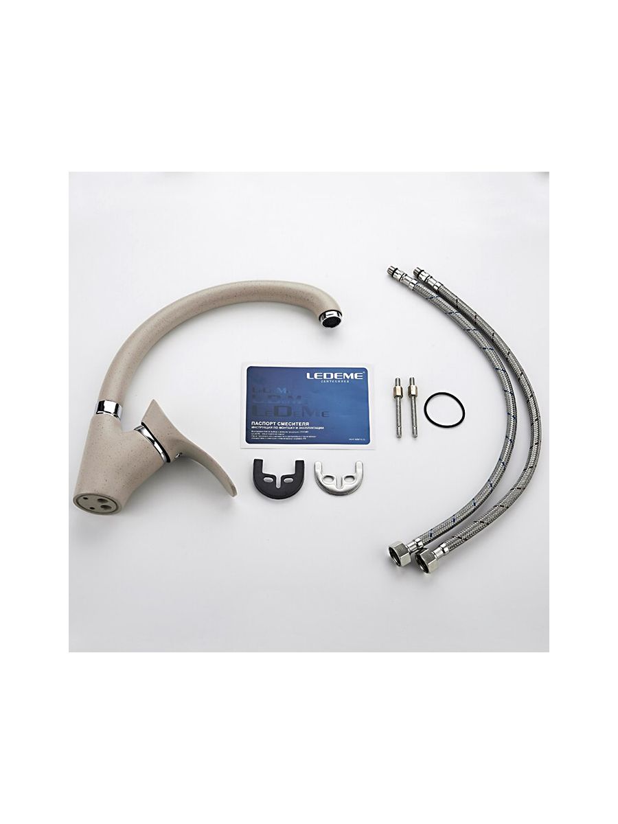 Смесители под торговой маркой LEDEME изготовлены из высококачественной латуни с хромированным покрытием и соответствуют общеевропейским и международным стандартам качества. В ассортименте представлены смесители различного направления дизайна и назначения, с двумя маховиками или однорычажные, хромированные, матовые, гранитные, тропический душ и другие.Смеситель LEDEME L4101K предназначен для использования на кухне. Смешивание горячей и холодной воды происходит с помощью керамического картриджа диаметром 40 мм. Смеситель однорычажный, с поворотным изливом высотой 200 мм, материал смесителя латунь с нанесением покрытия имитирующее гранит бежевого цвета, крепление на кухонной мойке с помощью шпилек. В комплекте прилагается подводка к смесителю. Гарантия 3 года.