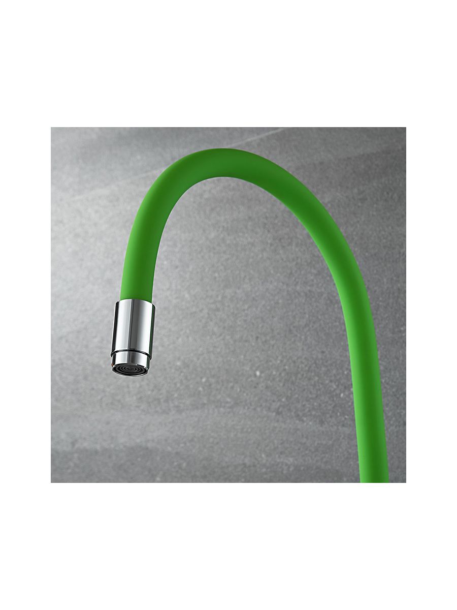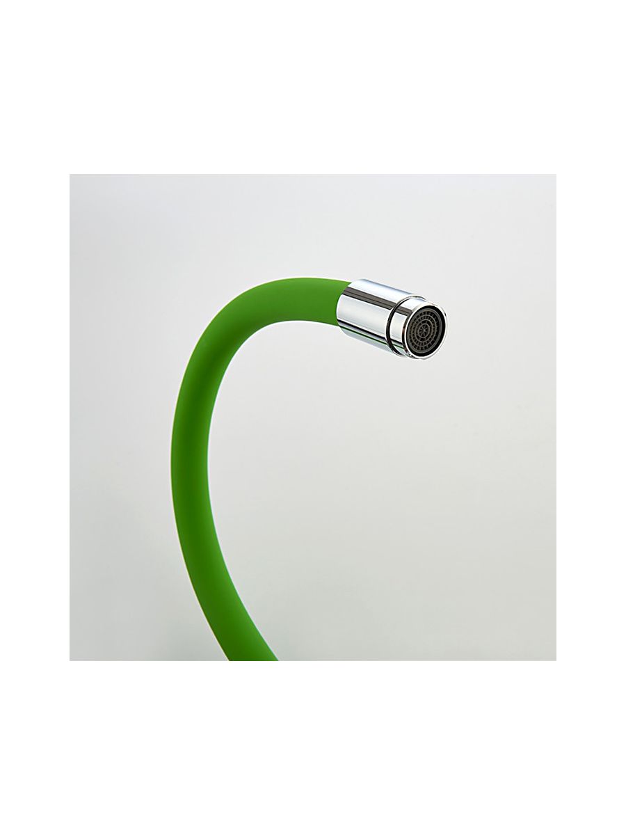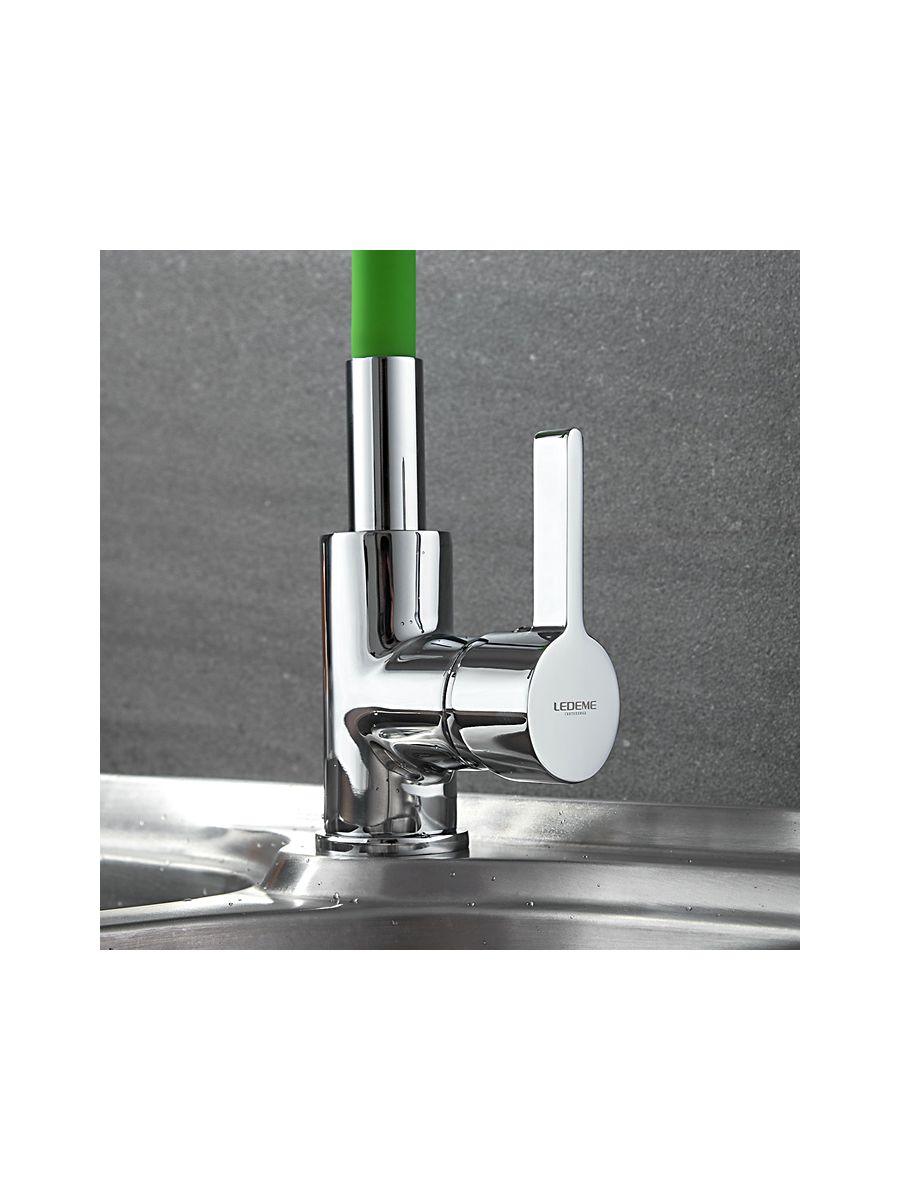 Смеситель кухня LEDEME гибкий шланг зелёный L4898-5 в коллекции смесителей из серии силиконовых смесителей с цветным покрытием успешно сочетаются с современным дизайном с применением необычных форм деталей. Такой контраст делает модель оптимальной для интерьеров в современном стиле, сочетающих функционализм и комфорт для пользователей. Конструкция моделей основана на использовании керамического смешивающего картриджа, имеющего повышенный ресурс и пропускную способность, изготовлен из прочной, долговечной высокркачественой латуни, Гибкий излив с аэратором максимально увеличивает удобство использования и насыщенность воды кислородом, аэрация струи происходит за счет увеличения площади потока. Удобная эргономичная ручка смесителей имеют форму, удобную для захвата ладонью и значительные размеры, что позволяет уменьшить усилия, необходимые для изменения температуры и напора воды.