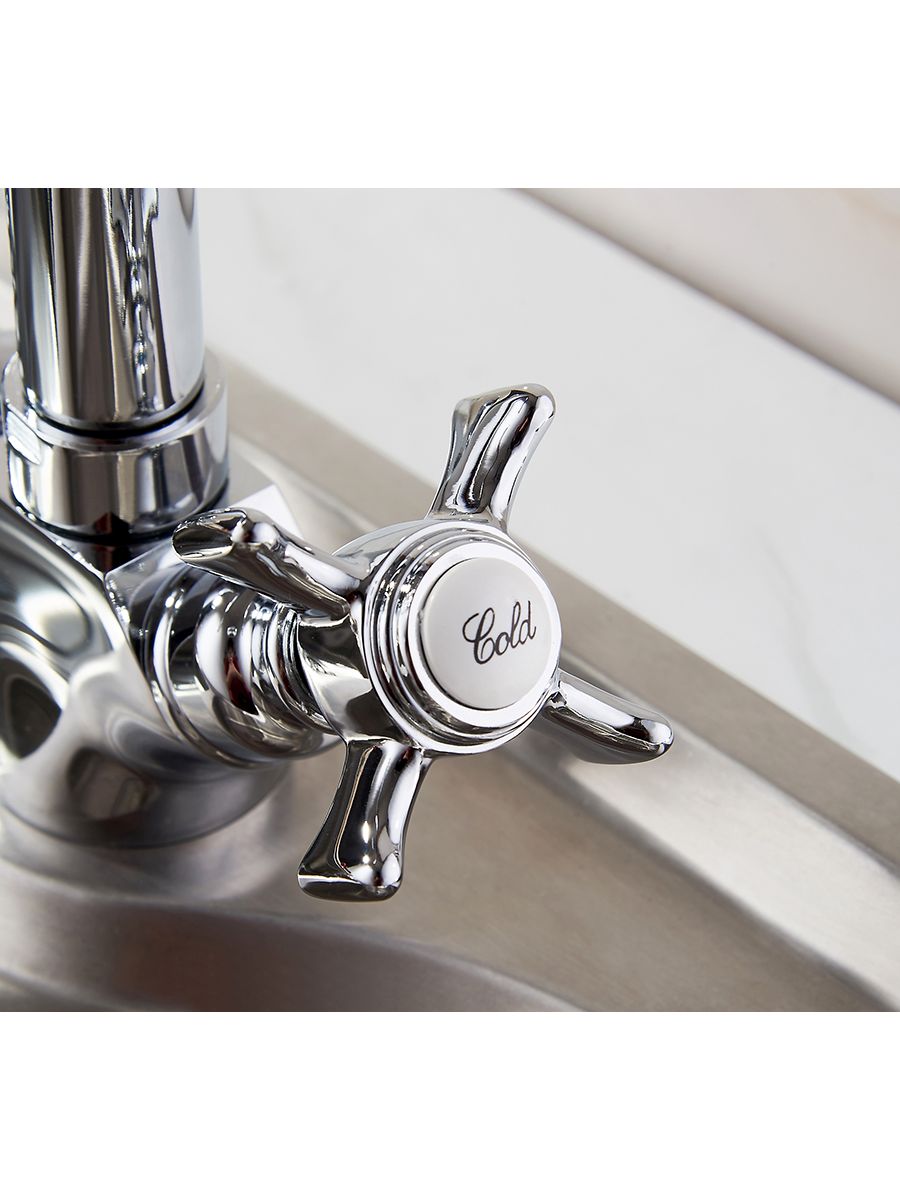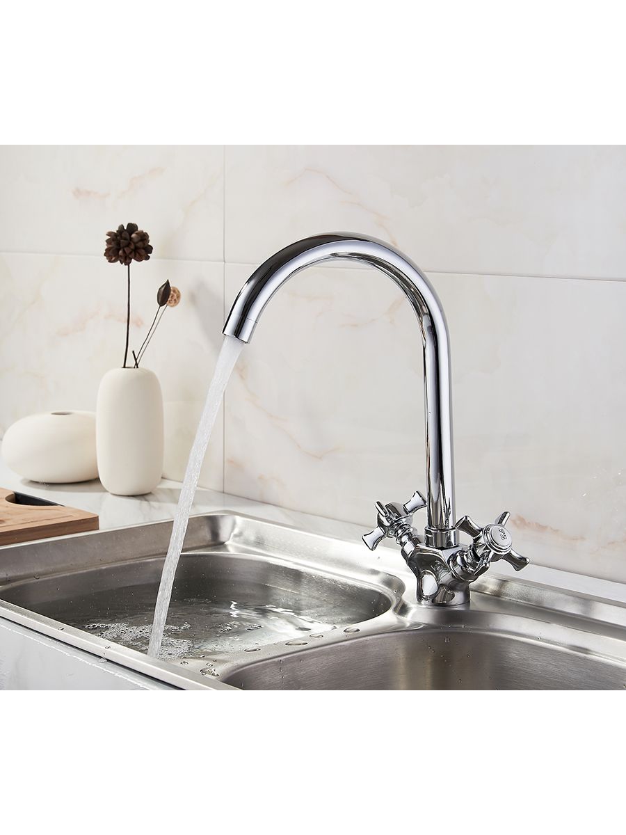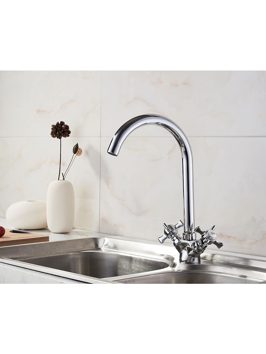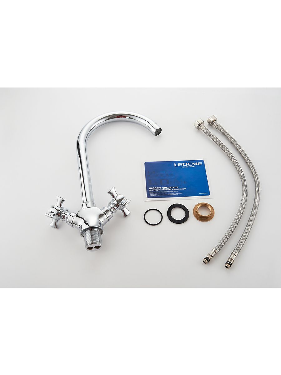 Смеситель кухня LEDEME литой излив, крест керамика, с гайкой, цинк, L4311-2 cмесители под торговой маркой LEDEME изготовлены из высококачественной латуни с хромированным покрытием и соответствуют общеевропейским и международным стандартам качества. В ассортименте представлены смесители различного направления дизайна и назначения, с двумя маховиками или однорычажные, хромированные, матовые, гранитные, тропический душ и другие.Смеситель LEDEME L4311-2 из серии H11 предназначен для использования на кухне. Смешивание горячей и холодной воды происходит с помощью двух металлических крестообразных маховиков и керамических кран-букс. Смеситель с поворотным изливом высотой 250 мм, крепление на кухонной мойке с помощью обжимной гайки. В комплекте прилагается подводка к смесителю. Гарантия на комплектующие 1 год.