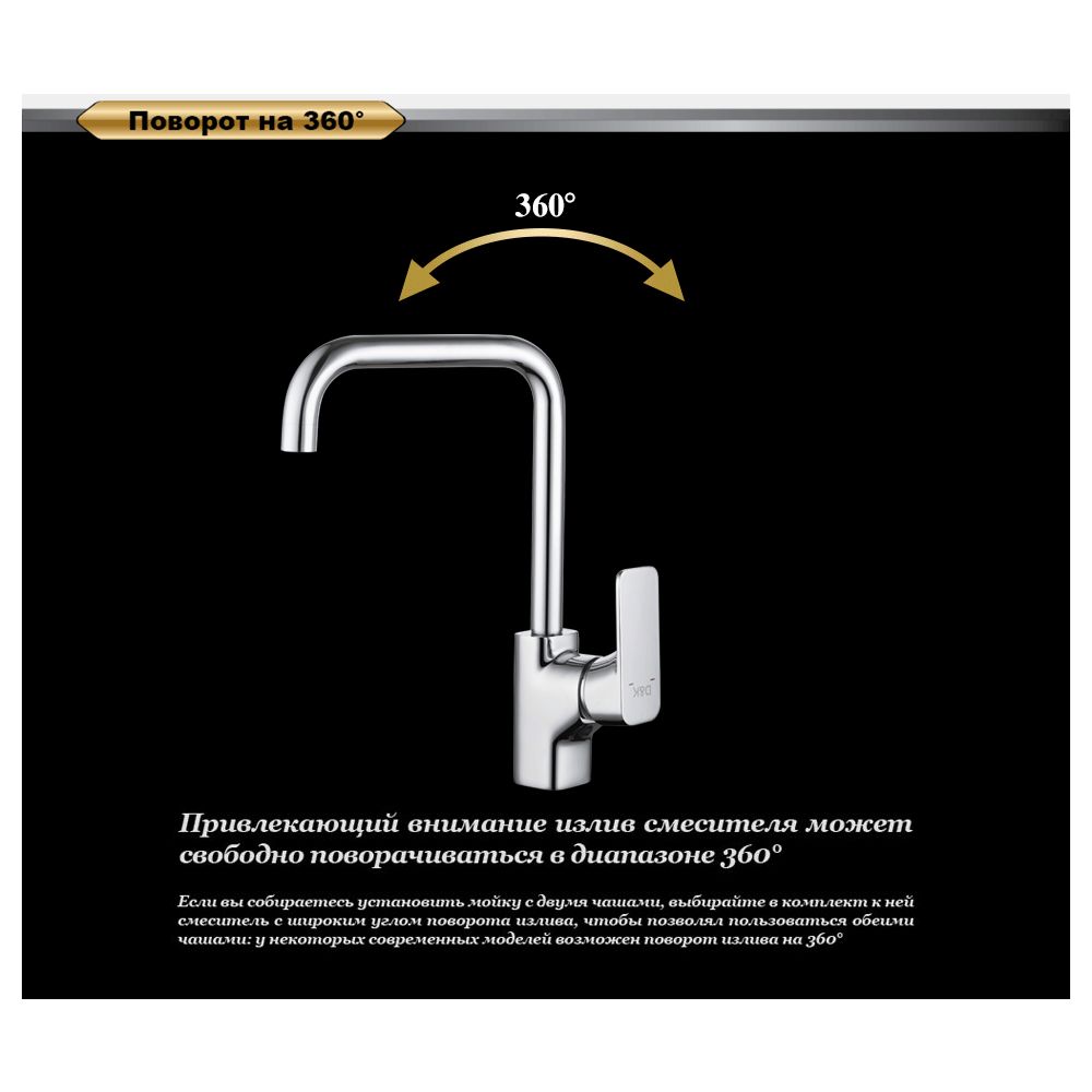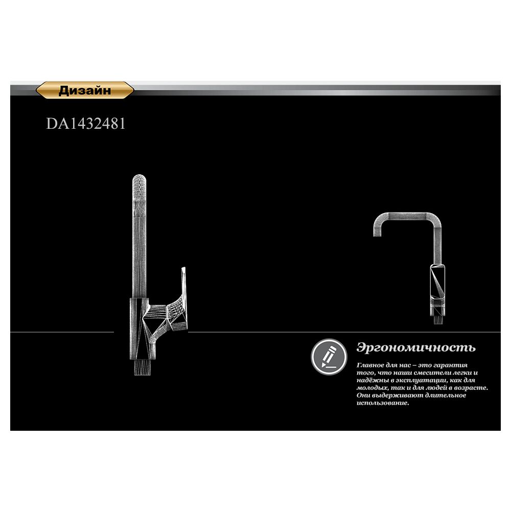 Строгие черты подчеркивают индивидуальность каждой кухни. Ручка и излив правильно подобраны по размеру, для удобной повседневной эксплуатации на долгие годы.