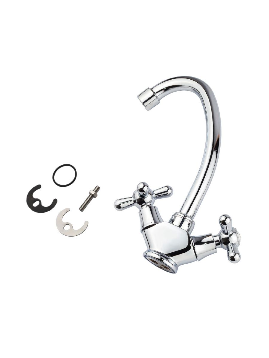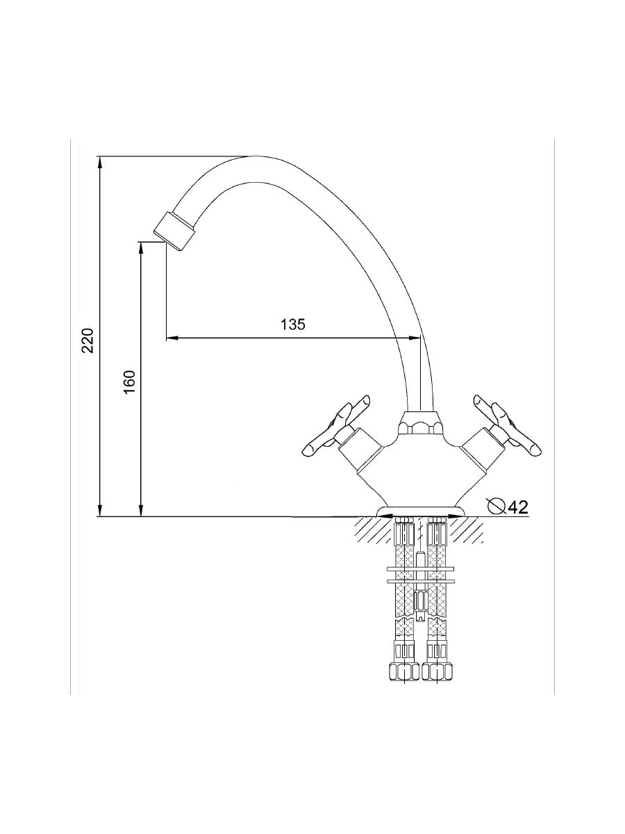 Кухонный смеситель тип "ёлочка" выполнен из латуни, имеет J-излив из нержавеющей стали с пластиковым аэратором и пластиковые маховики тип "крест", популярная по дизайну модель. Крепеж тип "шпилька". Кран-буксы керамические 1/2". Гибкая подводка в комплект не входит.