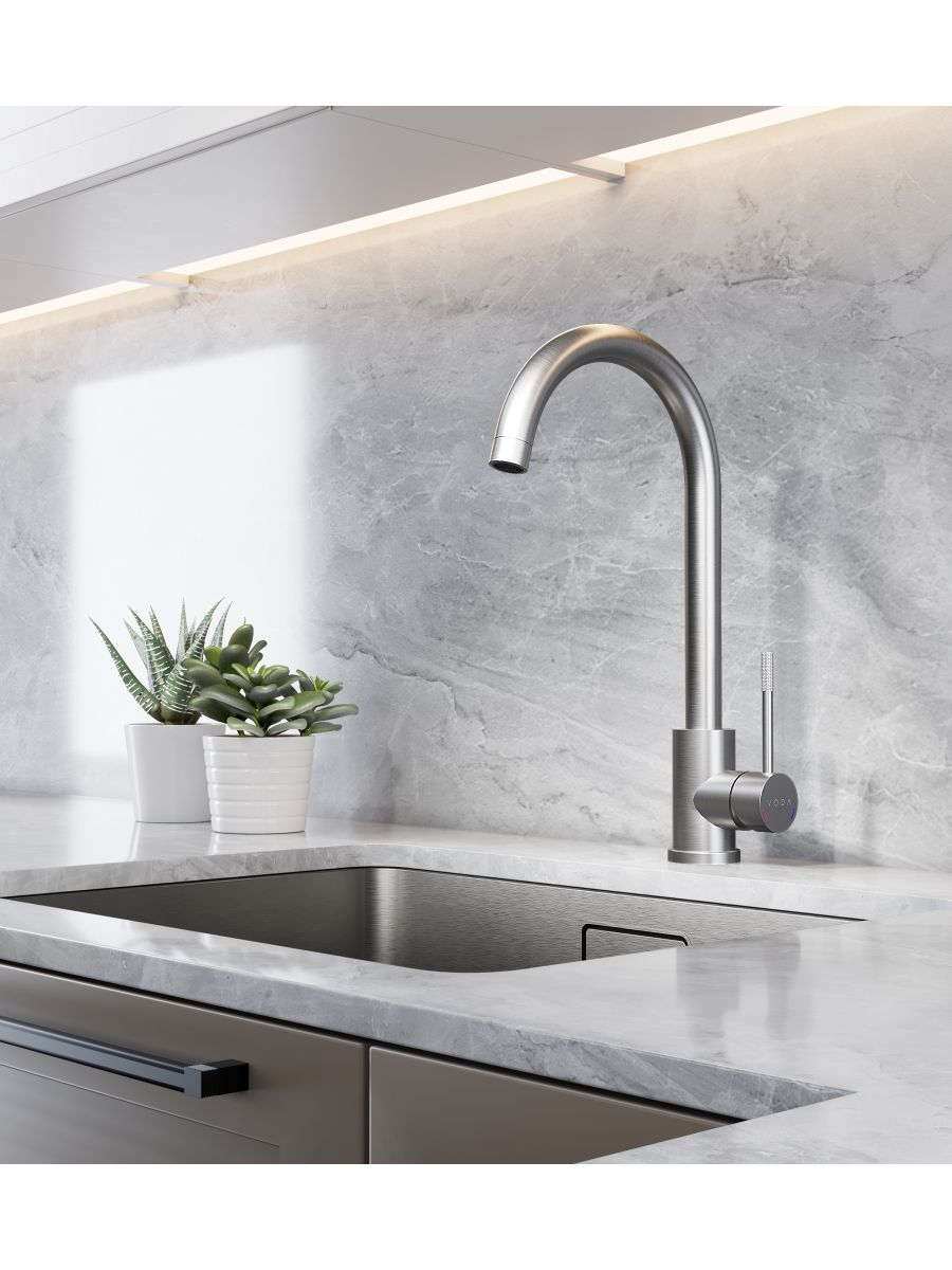 Корпус: нержавеющая сталь, марка AISI 304 (пищевая сталь) Излив: поворотный, нерж. сталь Картридж: универсальный VODA, 35мм Комплектация: пьедестал(металл), ребро жесткости, крепление "FastFix",гибкая подводка 45см.