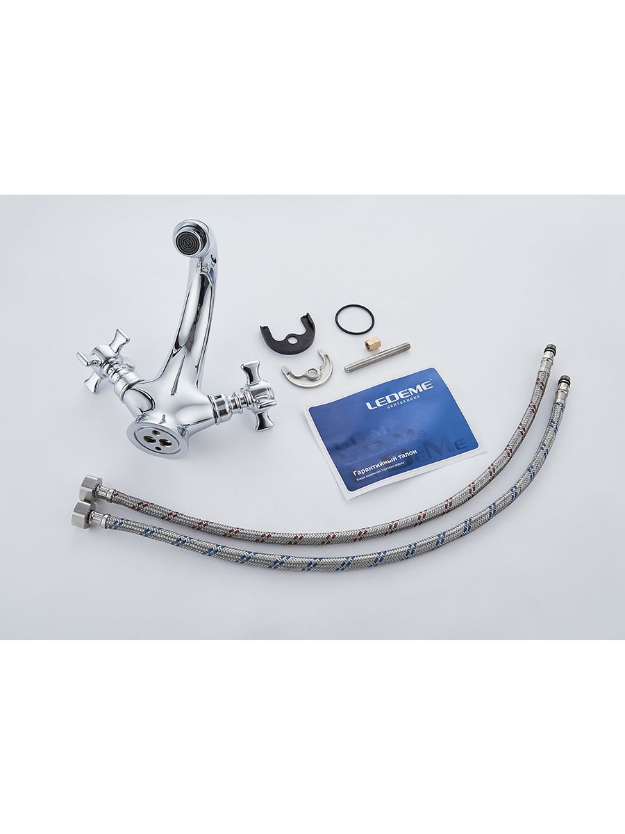 Смеситель умывальник LEDEME литой излив крест керамика L1011 cмесители под торговой маркой LEDEME изготовлены из высококачественной латуни с хромированным покрытием и соответствуют общеевропейским и международным стандартам качества. В ассортименте представлены смесители различного направления дизайна и назначения, с двумя маховиками или однорычажные, хромированные, матовые, гранитные, тропический душ и другие.Смеситель LEDEME L1011 из серии H11 предназначен для использования в умывальниках. Смешивание горячей и холодной воды происходит с помощью двух крестообразных металлических маховиков и керамических кран-букс. Смеситель монолитный с изливом высотой 150 мм, устанавливается на умывальник со стандартным отверстием под смеситель и крепится с помощью шпилек. В комплекте подводка к смесителю. Гарантия на комплектующие 1 год.