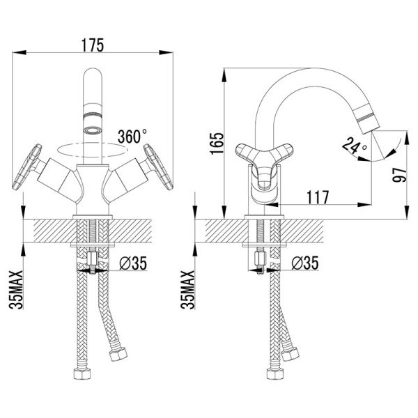 • Аэратор с изменяемым углом подачи воды• Кран-буксы с керамическими пластинами (угол поворота – 180°)• Гибкая подводка ½” 35 см• Присоединительная группа для настольного крепления• Металлические рукоятки