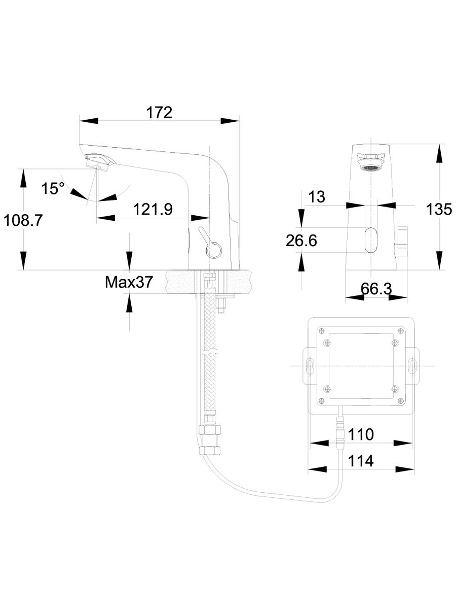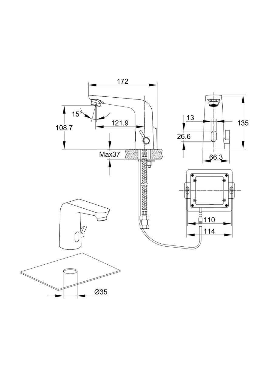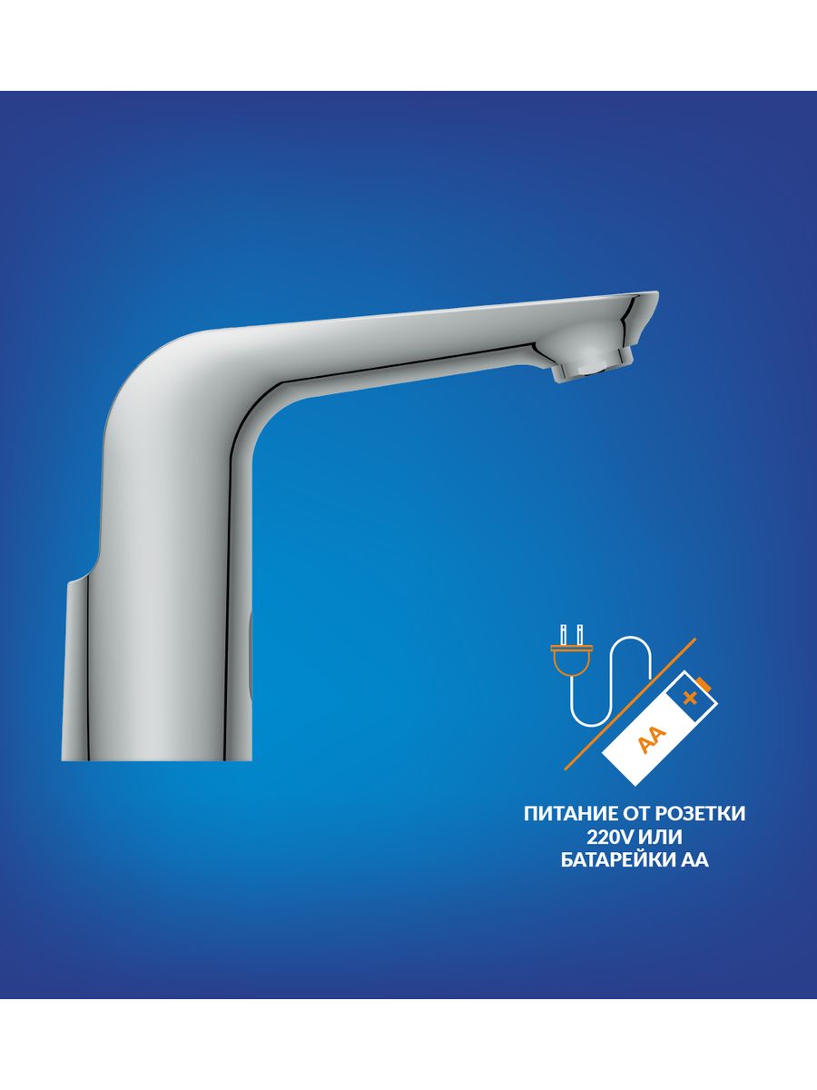 Комплектация: смеситель, подводка для воды, блок питания, крепеж, гарантийный талон, инструкция по эксплуатации