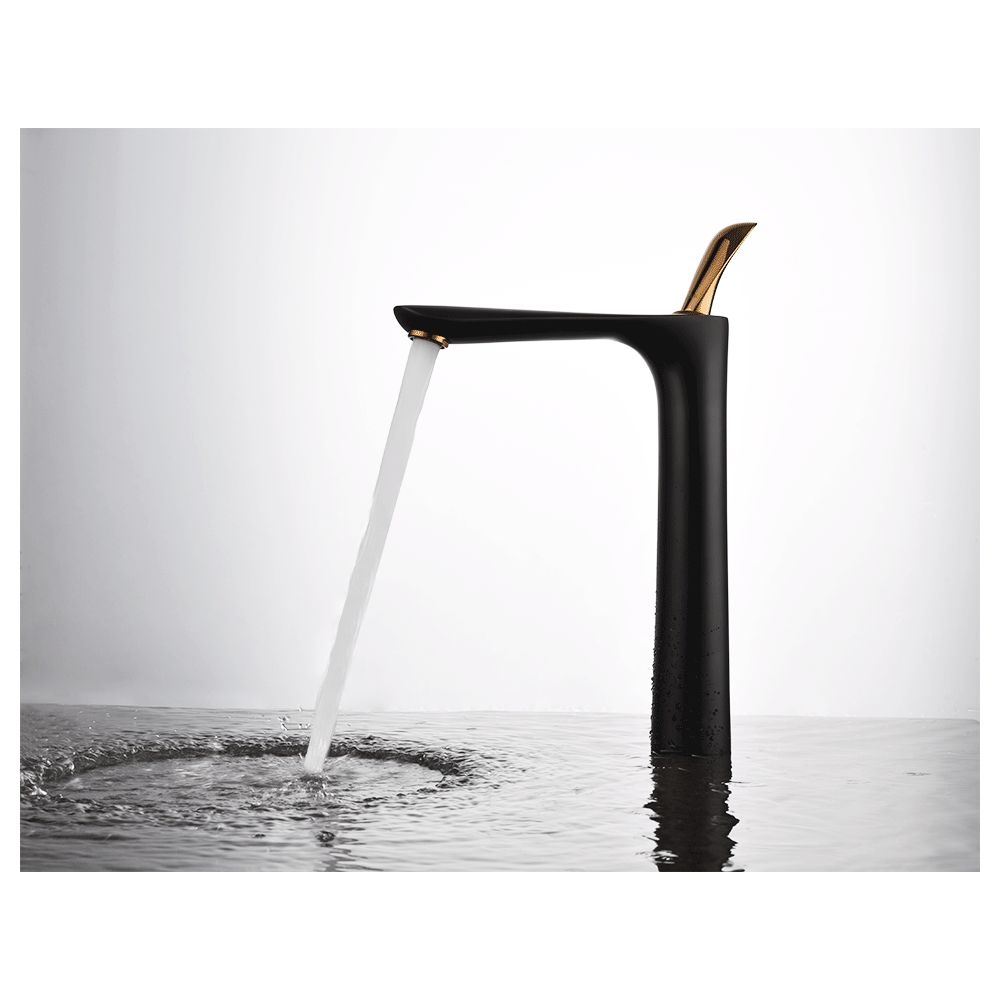 Правильная геометрия, идеальный пример минимализма и современного дизайна в ярком сочетании черного и золотого цветов для раковины-чаши в ванную комнату.