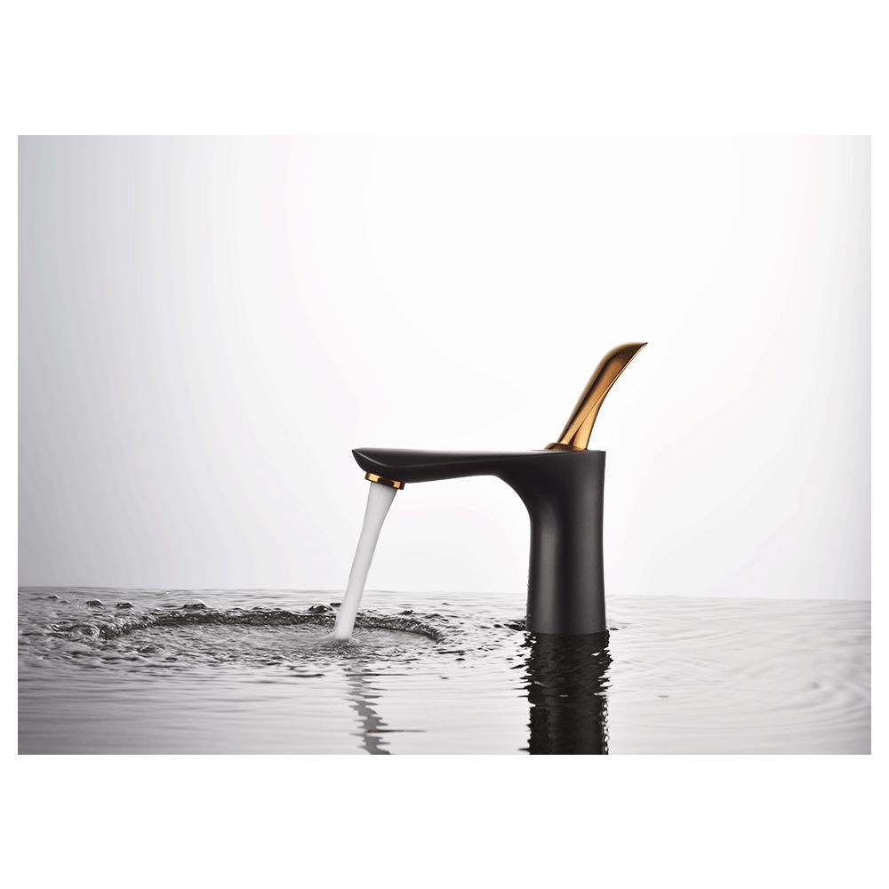 Правильная геометрия, идеальный пример минимализма и современного дизайна в ярком сочетании черного и золотого цветов для ванной комнаты.