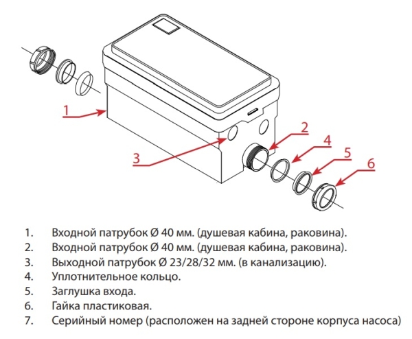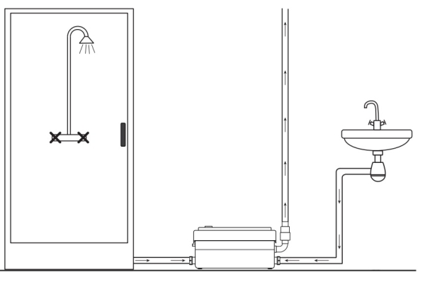 Санитарный насос Jemix STP-250 оборудован двумя входными отверстиями (диаметром 40 мм), к которым можно подвести трубы стоков от двух сантехнических приборов - душа или душевой кабины, раковины, умывальника - на выбор. Насос STP-250 без режущего механизма, поэтому он не применяется для отведения фекальных стоков от унитазов.
