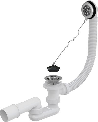 Сифон представляет собой классическую конструкцию, которая закрывает сливное отверстие в ванне, а также отверстие для перелива. Закрытие и открытие сливного отверстия происходит с помощью ПВХ заглушки, прикрепленной цепочкой к переливу. Максимальная высота между отверстием слива и отверстием перелива составляет 370 мм. Решетка перелива изготовлена из пластика с хромированной поверхностью, материал, из которого сделан слив-перелив Alcadrain устойчив к воздействию химических чистящих веществ и перепадам температур.