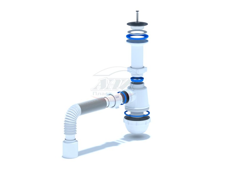 Сифон АНИ пласт "Грот" А0510 для кухонных моек с диаметром сливного отверстия 50-60мм, бутылочного типа. С литым выпуском и нержавеющей решеткой. Для подключения к канализации комплектуется гибкой трубой 40х50мм.